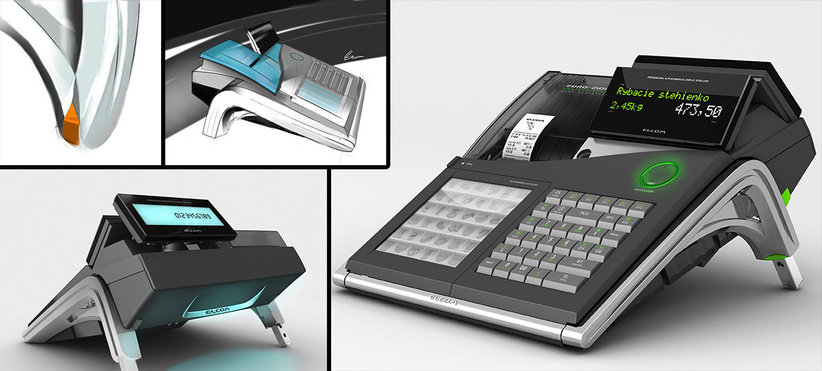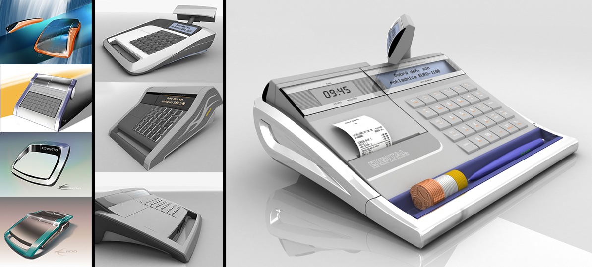 Cash register EURO 1100 • conceptual schetches, visualisations, 3d print, prototyping and final new product • Painter X, 3D studio MAX, Rhinoceros, Pro Engineer
